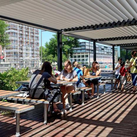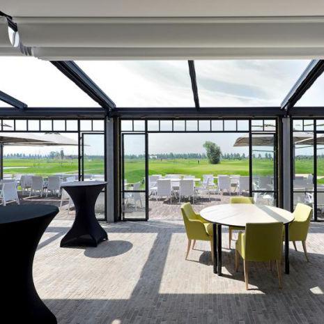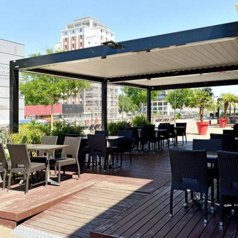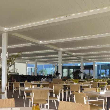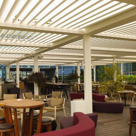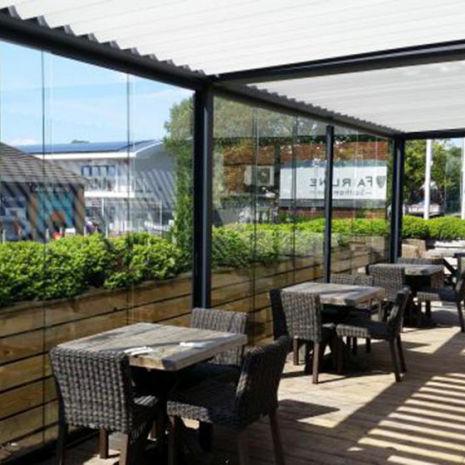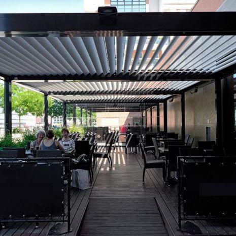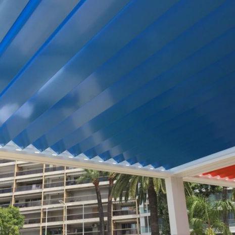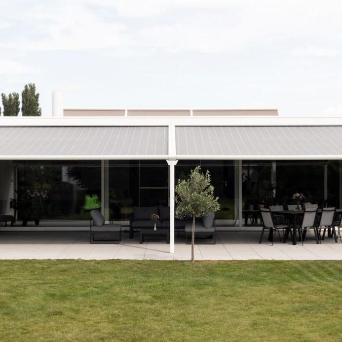 La pergola bioclimatique rétractable B-500 est une pergola fixée au mur, équipée d’un toit en pente en PVC. Le toit est imperméable à l’eau et protège du soleil. On peut l’ouvrir entièrement pour profiter au maximum d’un peu plus de lumière dans la pièce adjacente ou, au contraire, bénéficier d’une ombre suffisante lorsqu’il est déployé. L’évacuation de l’eau s’effectue par une gouttière à l’avant.