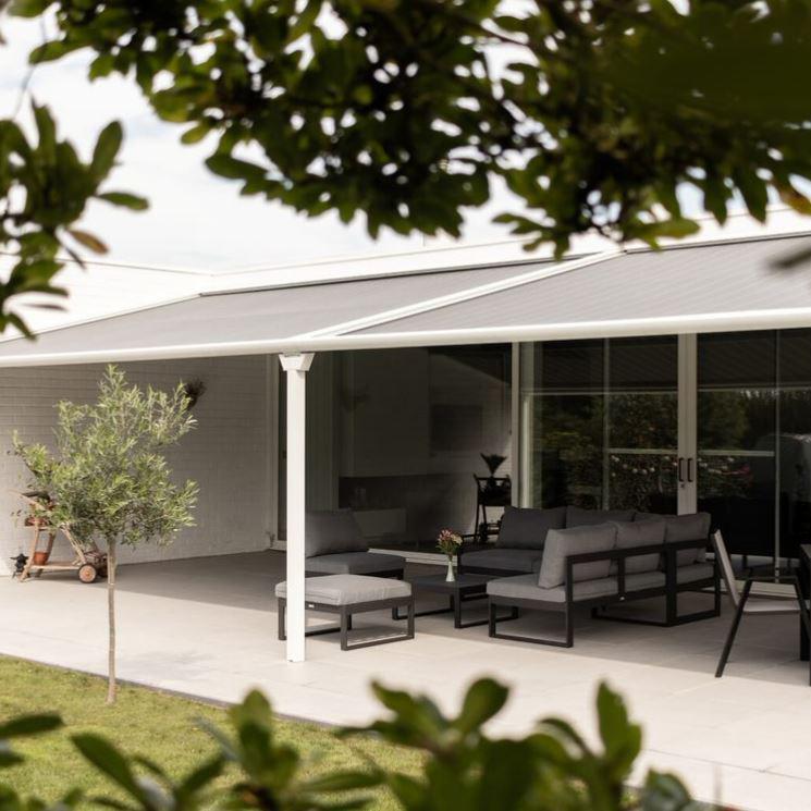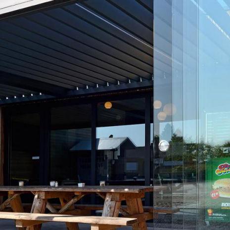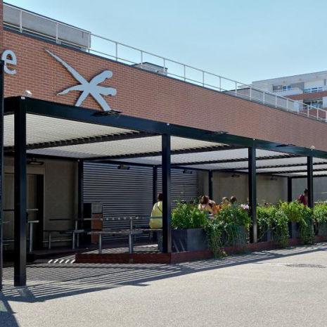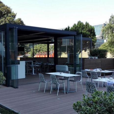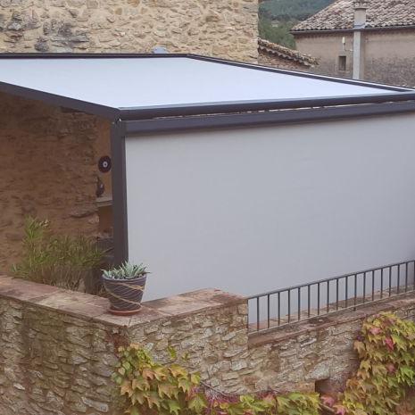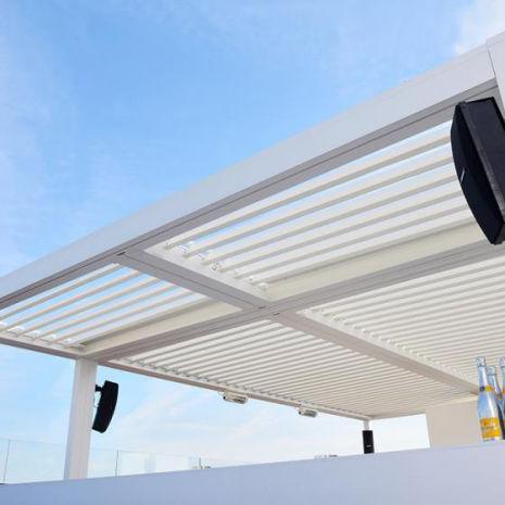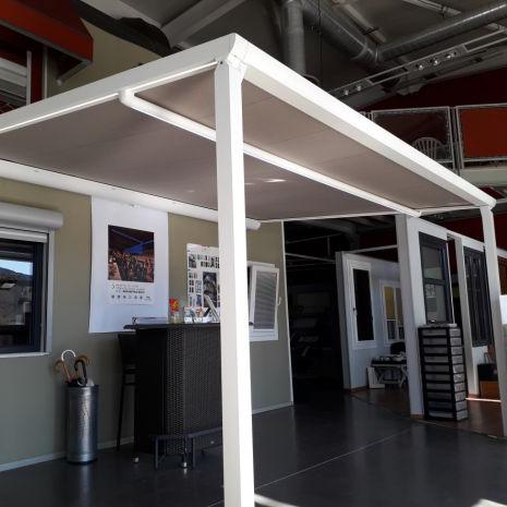 La B-128 Pergola toile est une structure autoportante où le store s’appuie sur des conducteurs latéraux, 2 poteaux et une fixation murale.