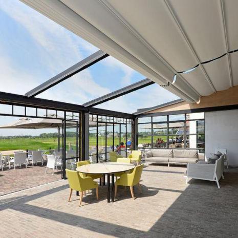 Sa toile PVC imperméable et protégeant du soleil s'ouvre complètement et permet ainsi de profiter d'un maximum de luminosité.